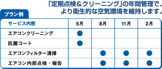 ※上記プラン例は、空気環境維持に必要な清掃項目を組み合わせたもので「エアコンフィルター清掃」「エアコン内部点検・報告」には、別途料金が必要になります。